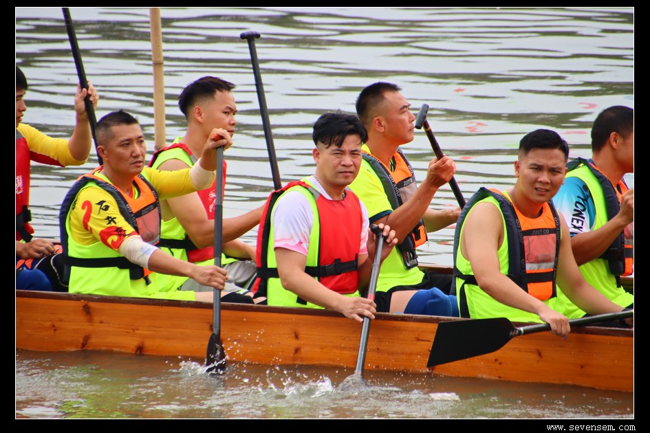 龙舟队员晒得黝黑的手臂青筋暴起,一桨接一桨划出水上速度与激情。