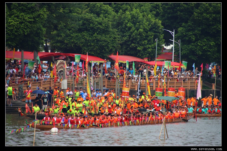 现场彩旗飘扬,人潮涌动,广佛两地21支龙舟队伍严阵以待,观众更期待枪手大战。