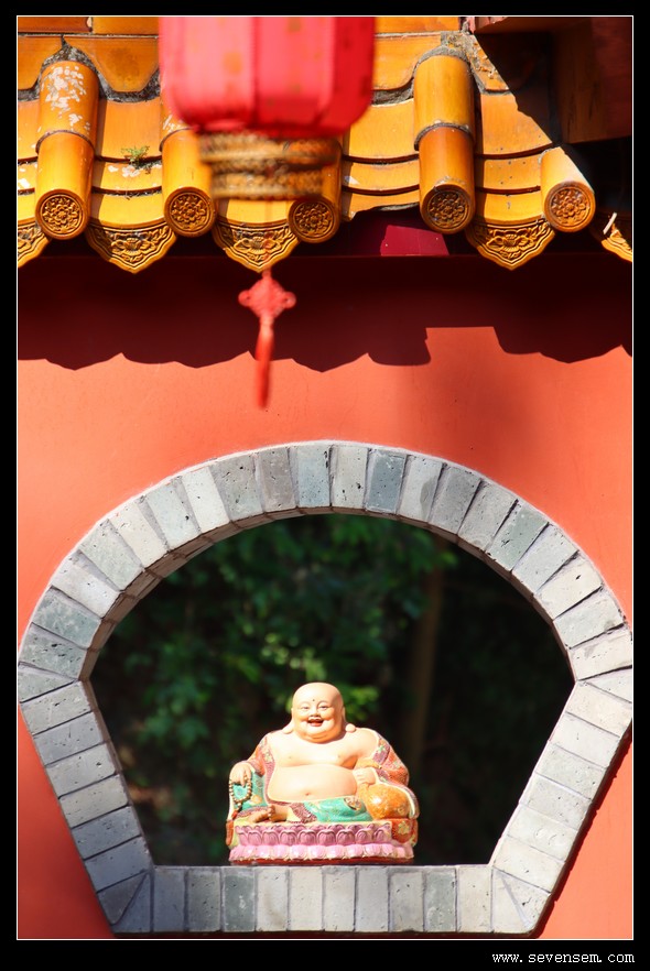 龙华古寺的红墙黛瓦在绿树间若隐若现