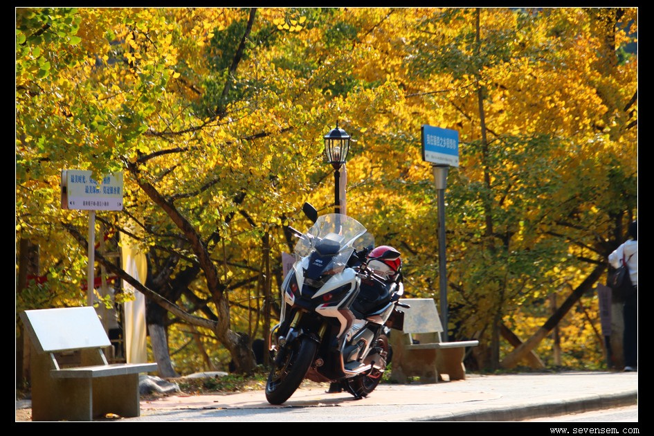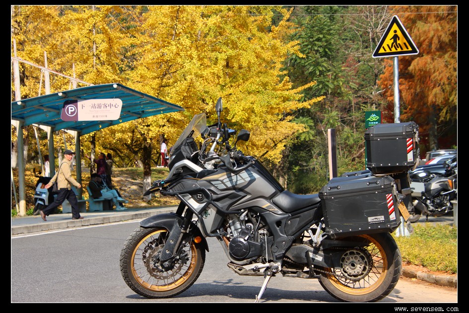 偶尔停下脚步,靠在车旁拍几张照片,蓝天、白云、金黄的银杏,还有我的铁骑,每一帧都美得像壁纸。