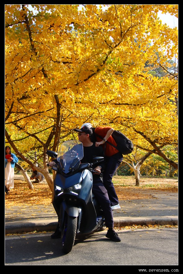 忍不住跨上摩托车,在林间缓缓穿行。车轮碾过铺满落叶的路面,发出清脆的“咯吱”声,两旁的银杏林像金色的隧道,一路延伸向远方。