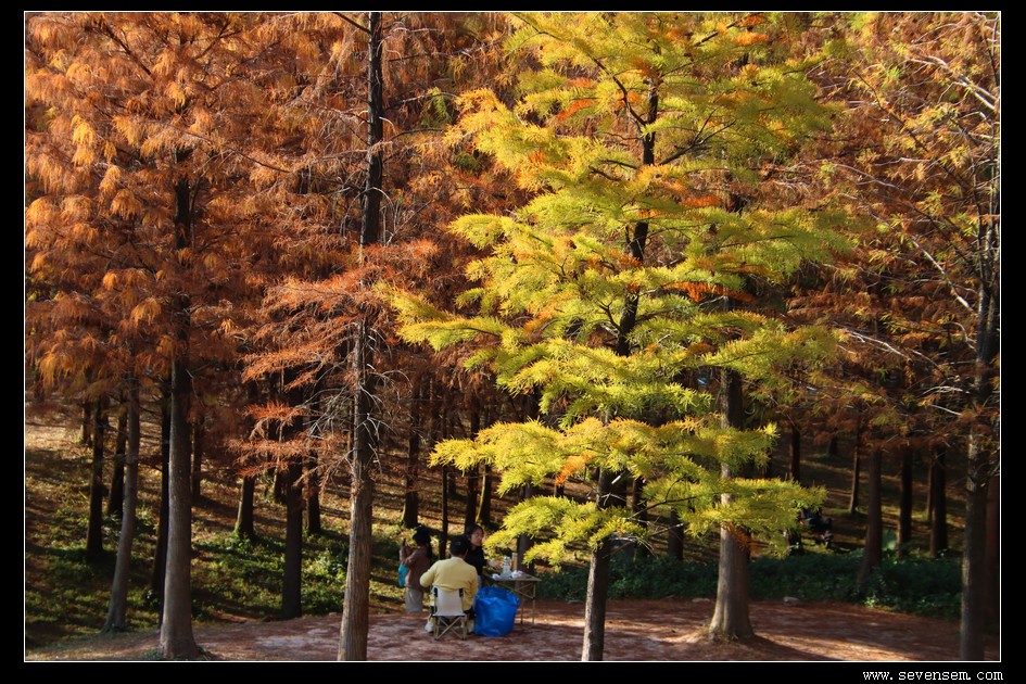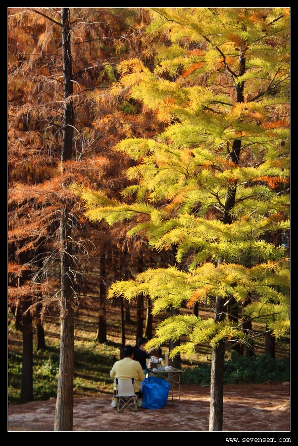 踏入公园的瞬间,整排落羽杉齐刷刷映入眼帘,浅黄、焦糖、棕红、深红层层交织,像被冬日暖阳烤透的蜜糖,连空气都裹着温柔的暖调 。