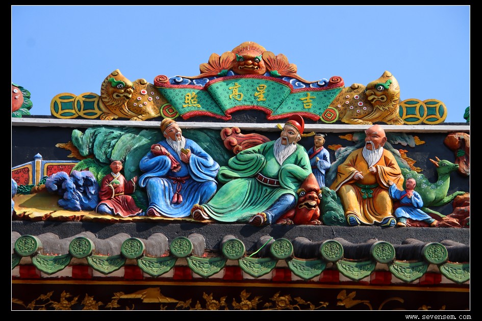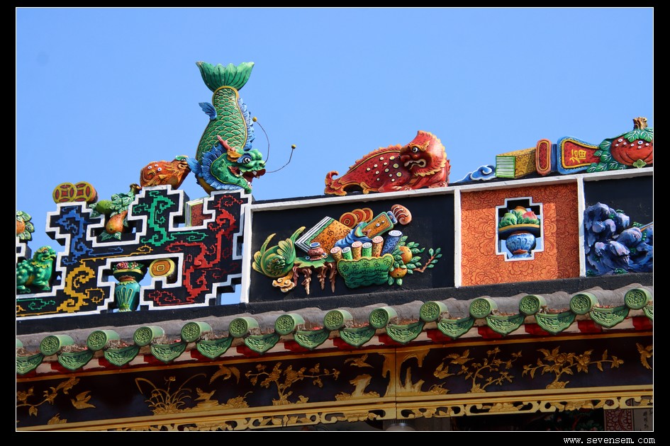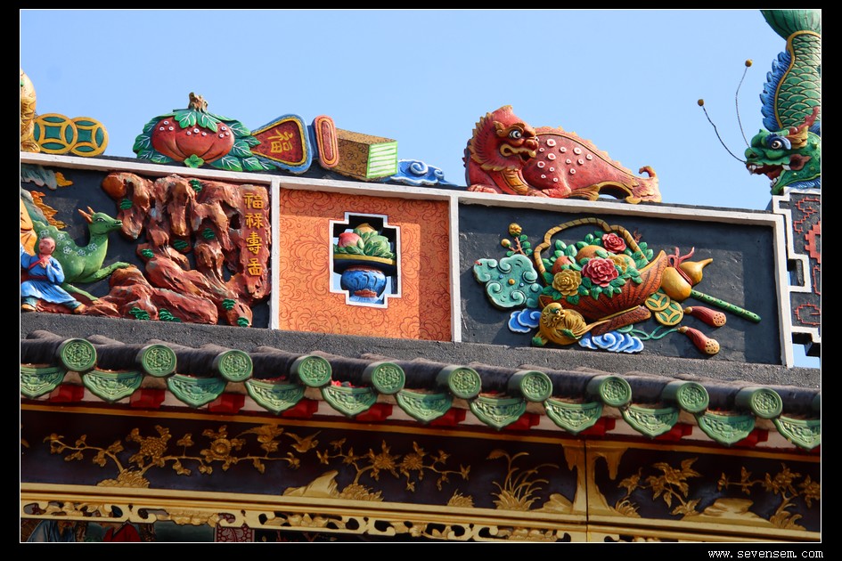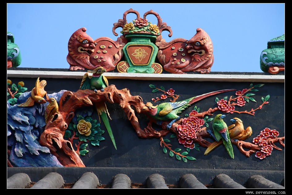 祠内更是别有洞天:屋顶的碌灰筒瓦印着“金玉满堂”“寿”字纹饰,斗拱间的木雕、砖雕、石雕精美绝伦,陶瓷花窗上的五子登科、仙鹤宝瓶图案,藏着古人对美好生活的期许。