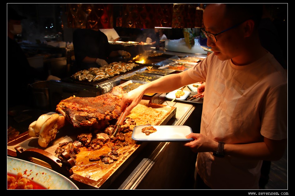 铁板牛排、羊排、烤生蚝、烤榴莲轮番上阵,现点现做,火候刚刚好。