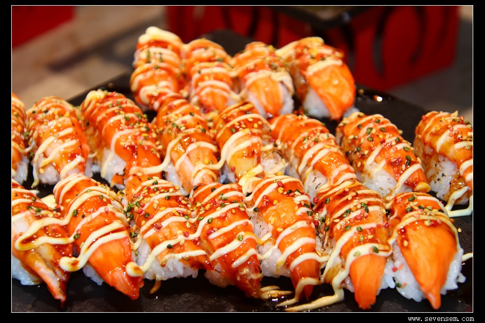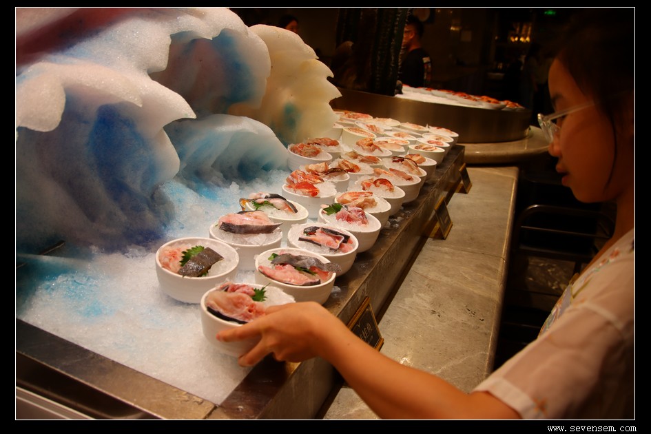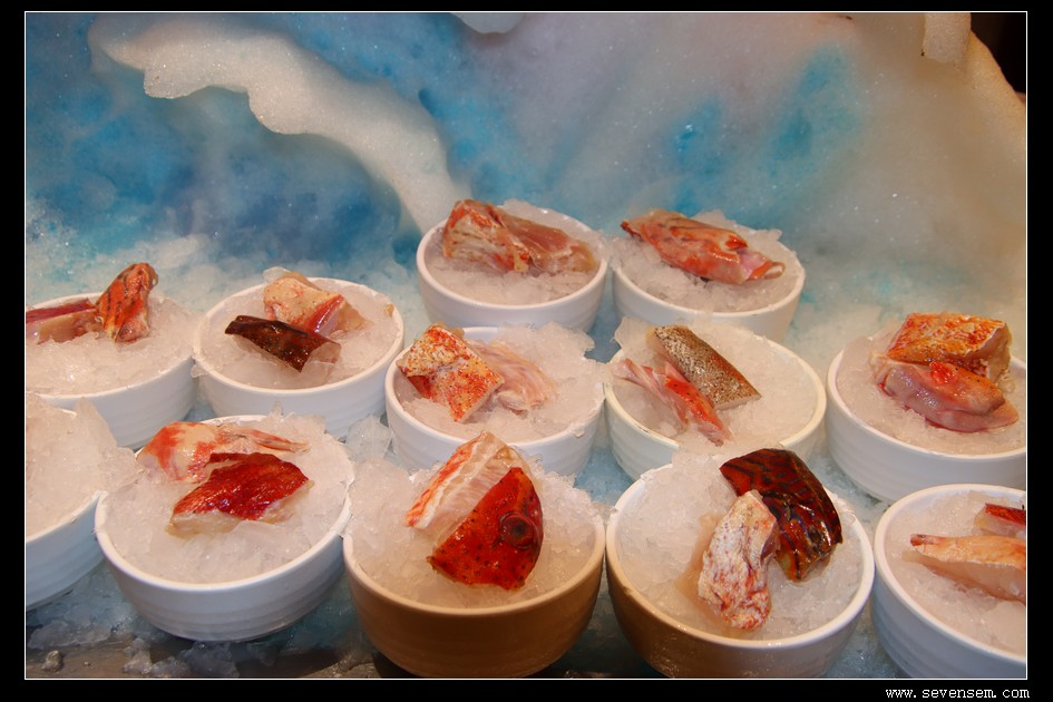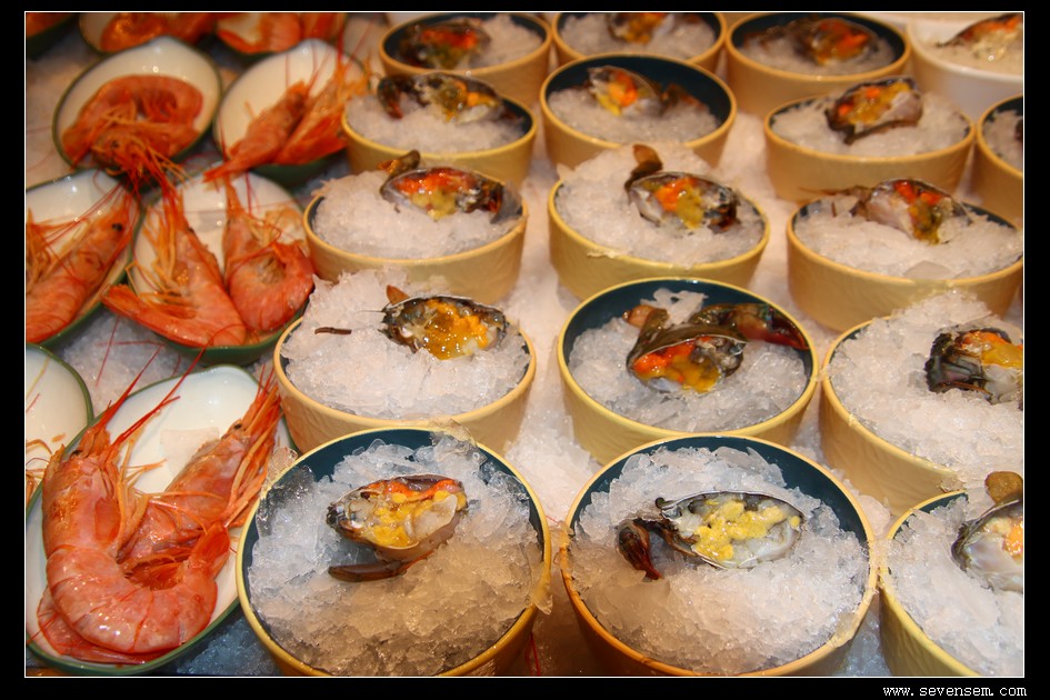 刺身区更是日料爱好者的天堂,厚切三文鱼腩、蓝鳍金枪鱼、爱尔兰鳌虾、北极贝、甜虾、海葡萄。