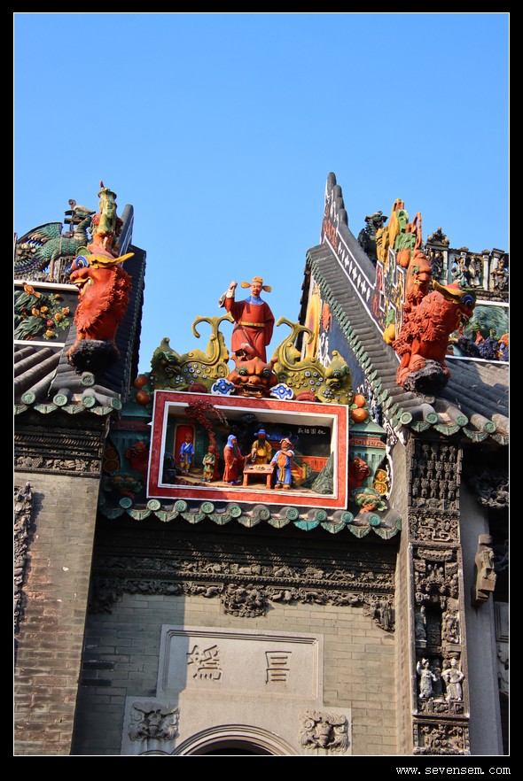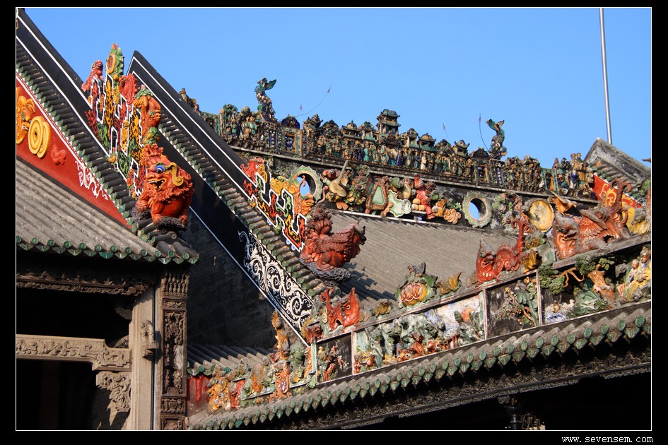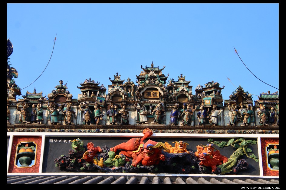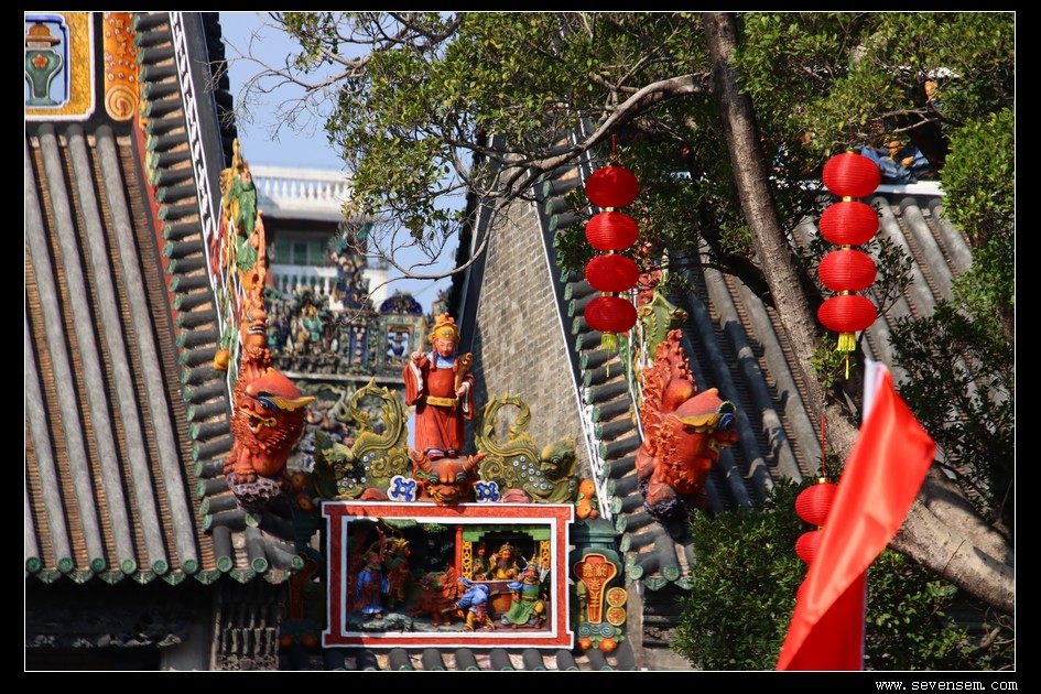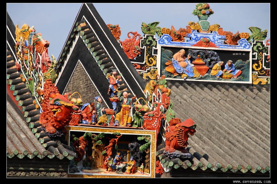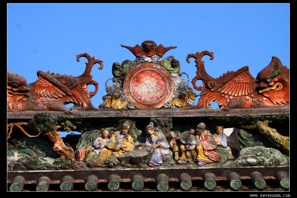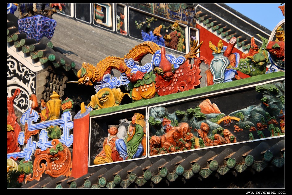 抬头是屋脊上长达百米的石湾陶塑,八仙贺寿、百鸟朝凤、历史演义,釉色流光,人物眉眼如生。