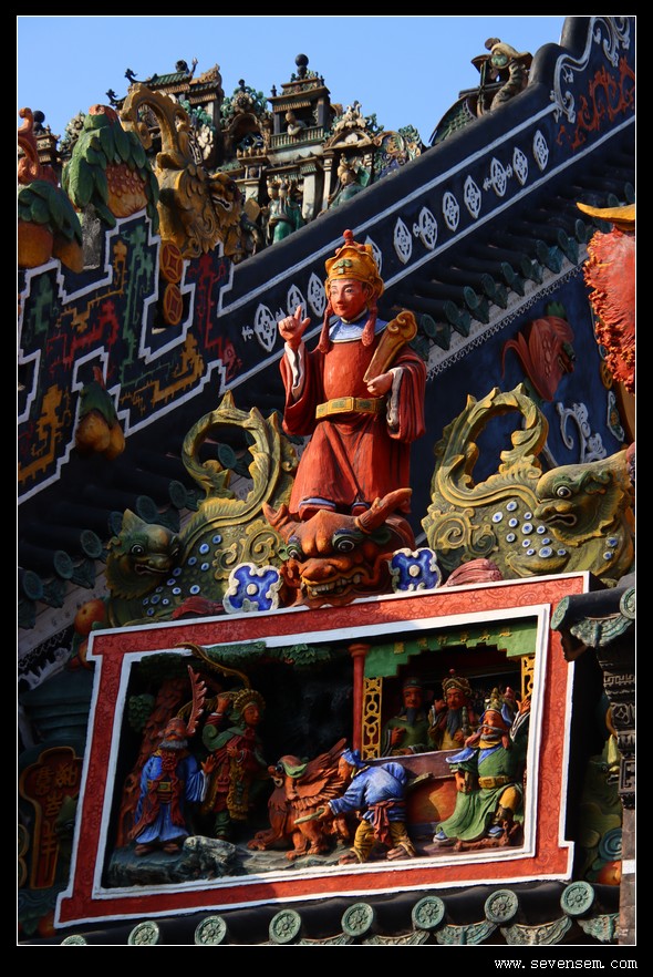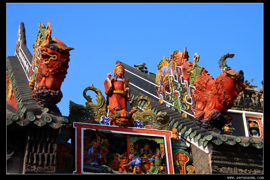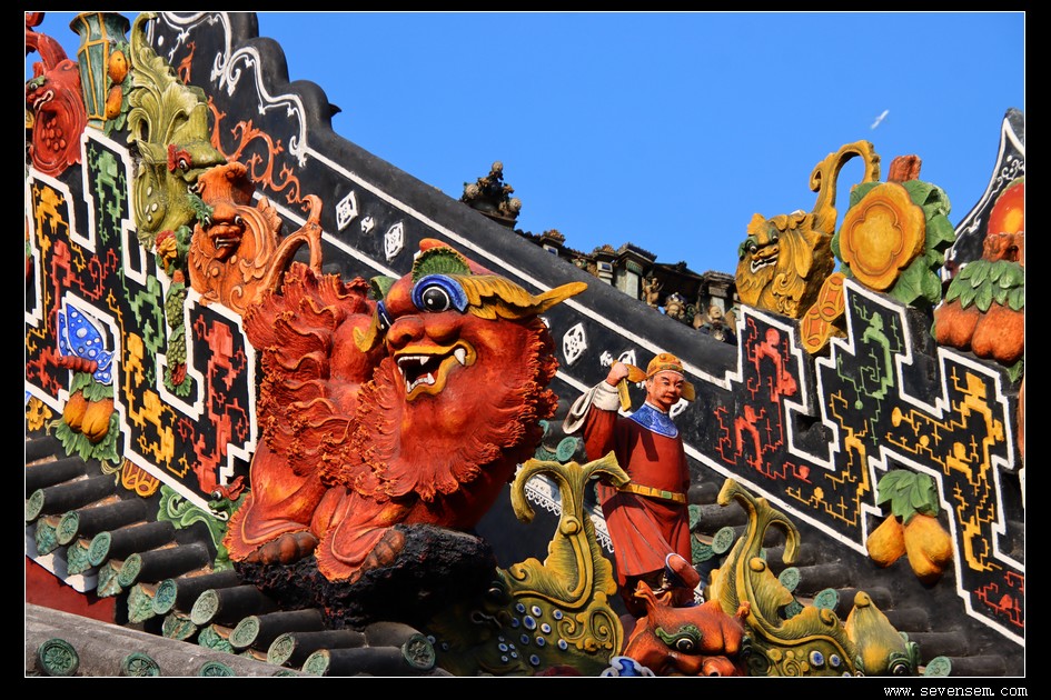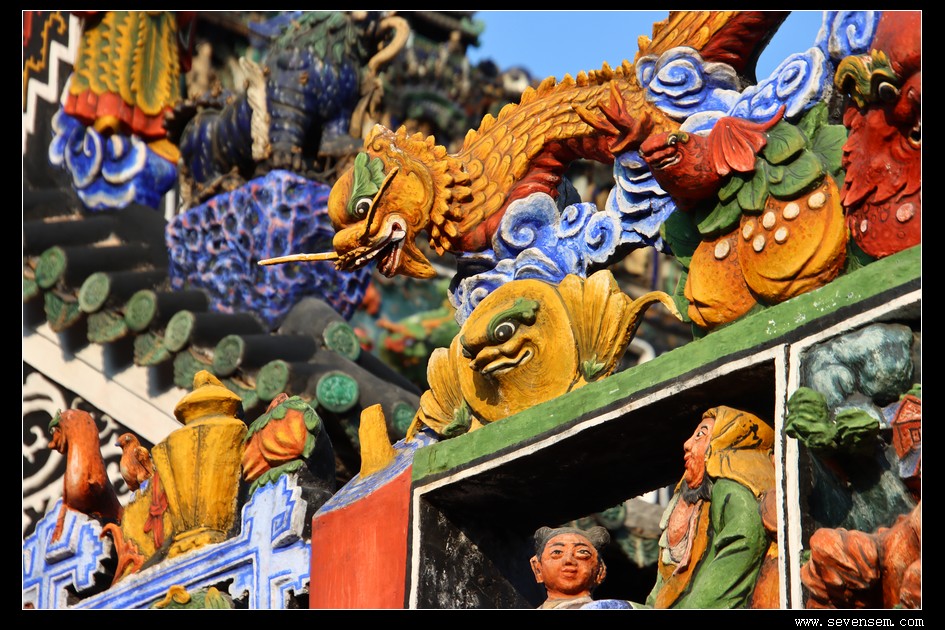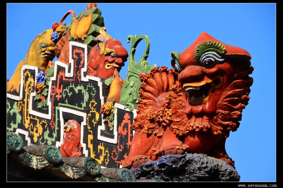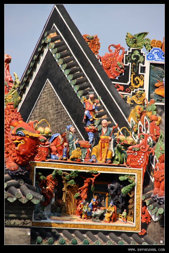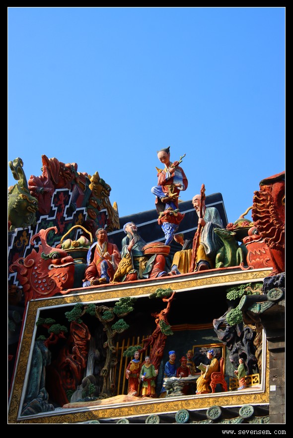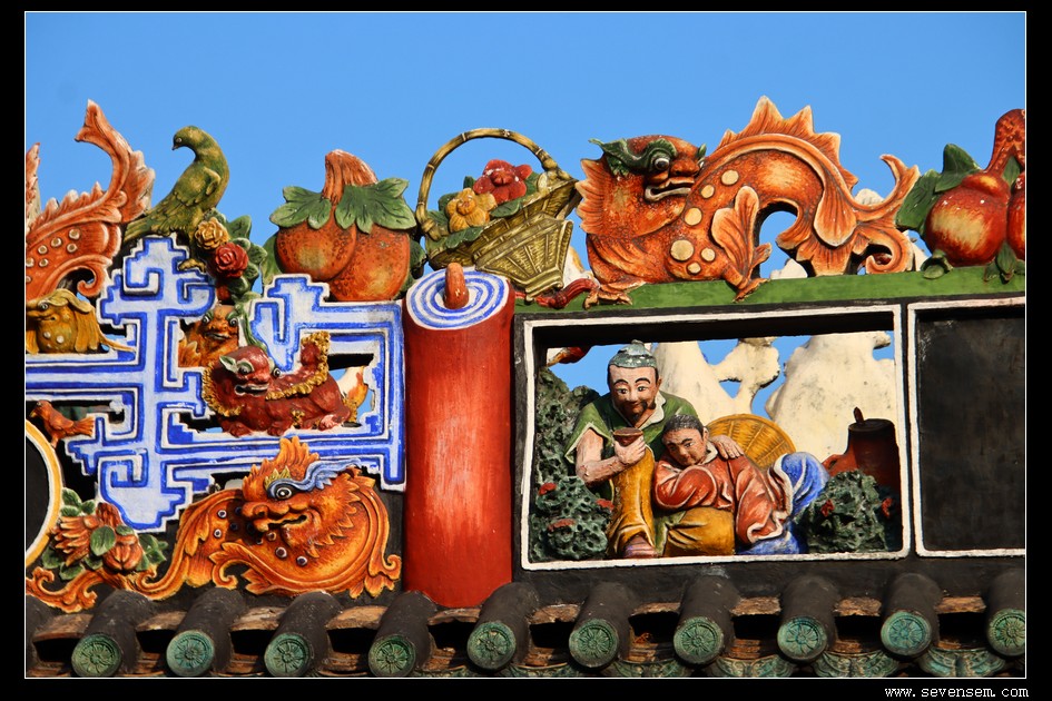 抬头是屋脊上长达百米的石湾陶塑,八仙贺寿、百鸟朝凤、历史演义,釉色流光,人物眉眼如生。