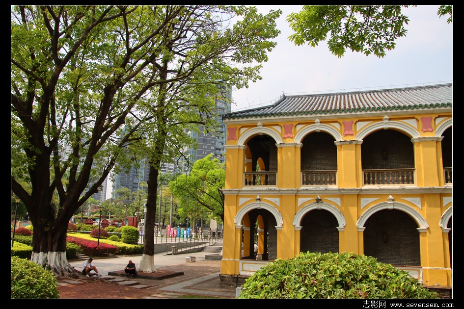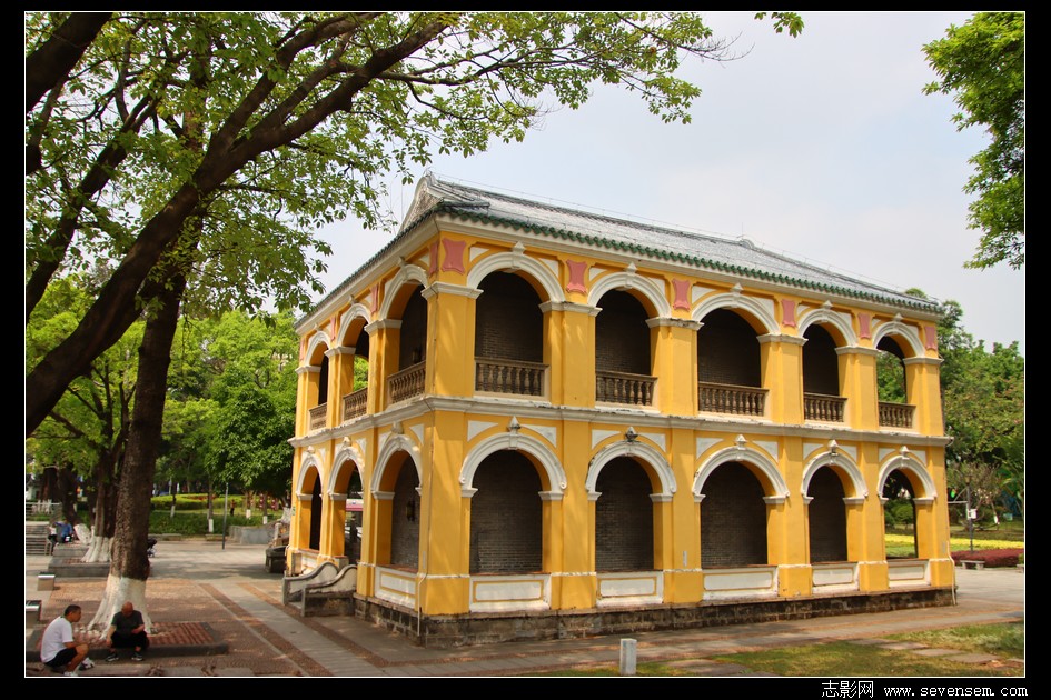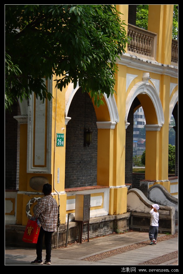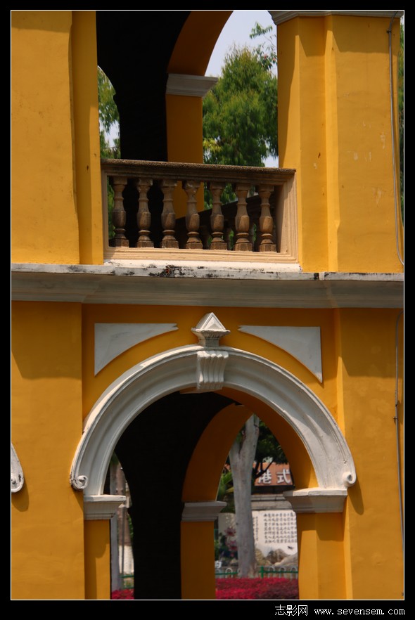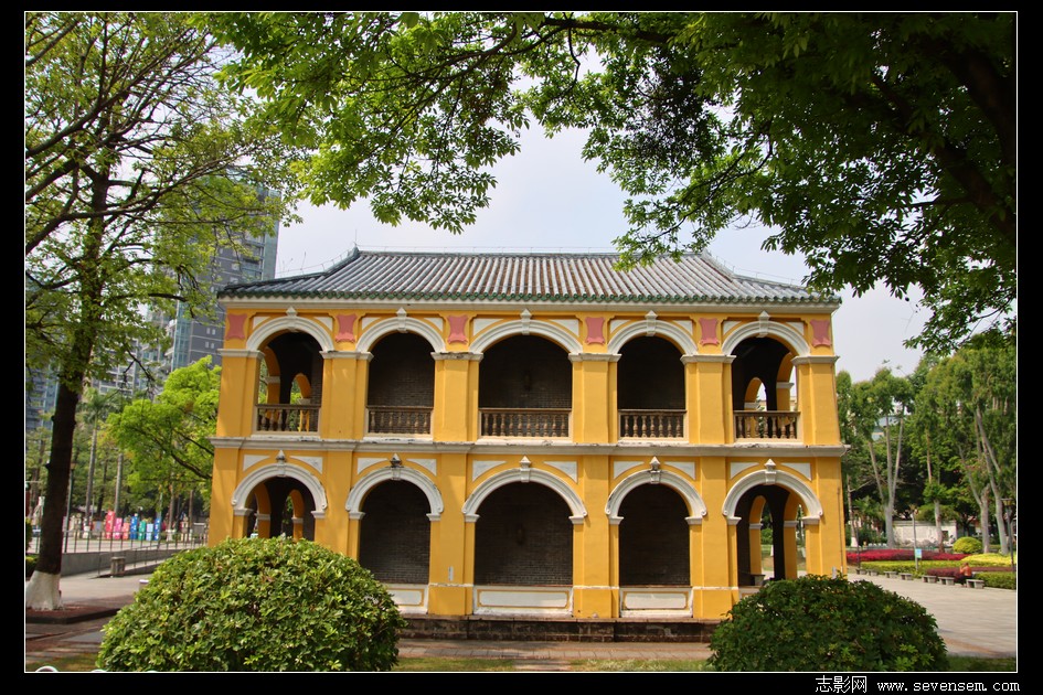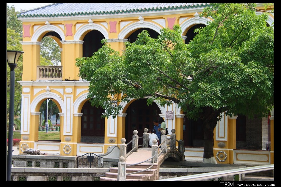 黄白相间的外墙、一圈圈马蹄形拱券回廊、歇山顶绿琉璃瓦,西式南洋殖民风的外观。