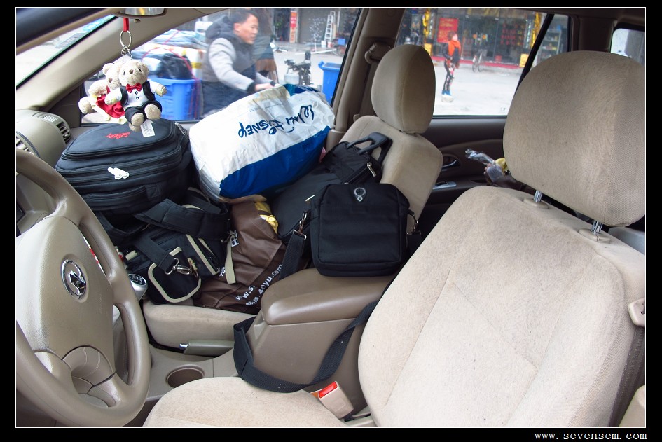 今年加左BB凳和BB车,所以衣物和行李都放到副驾位了,车厢放贺年礼物。