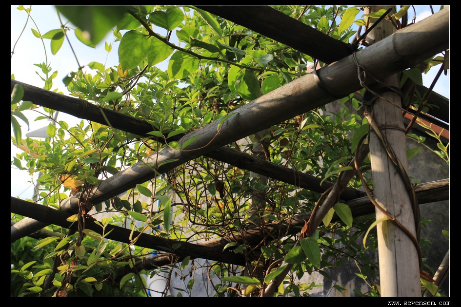 金银花棚还未爬满,不过好快就要给百香果藤霸占位置了。