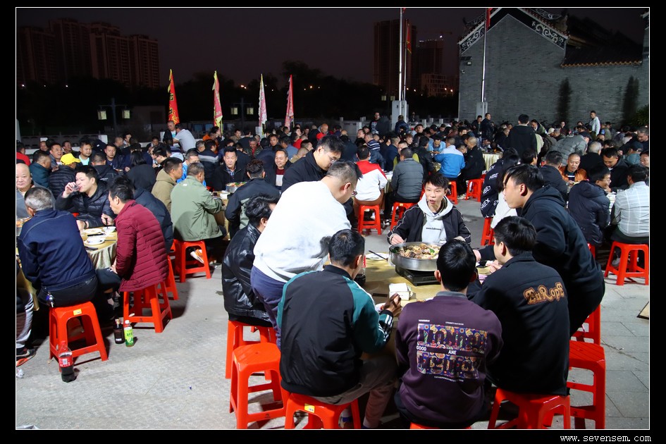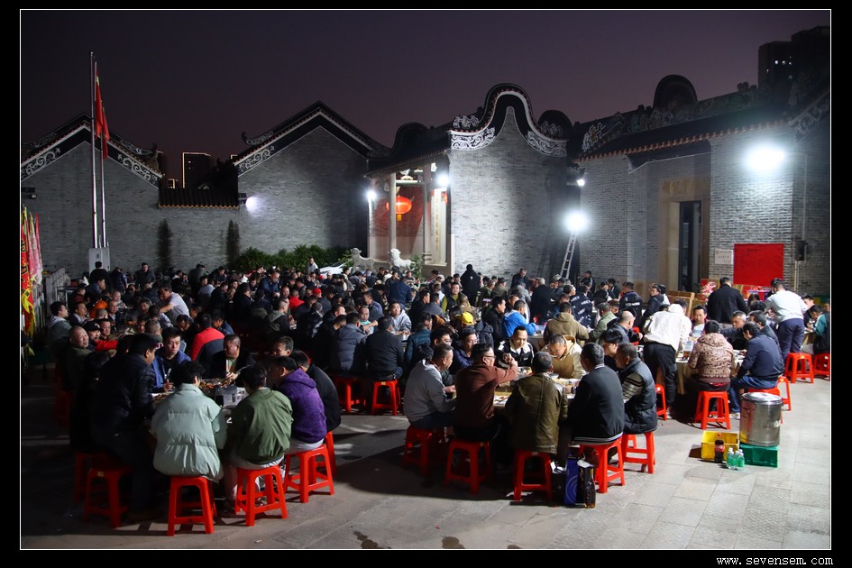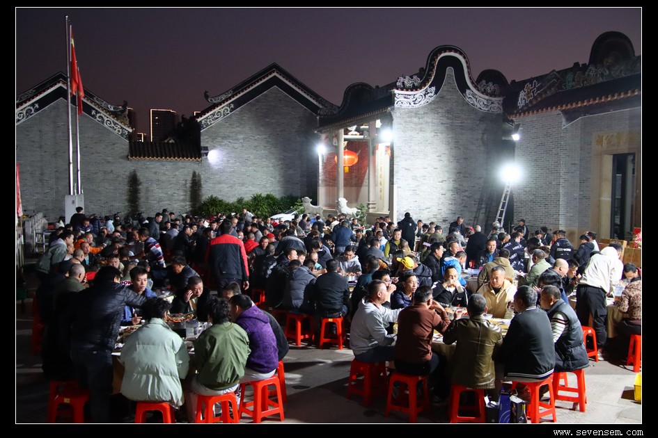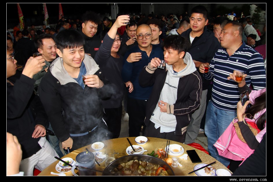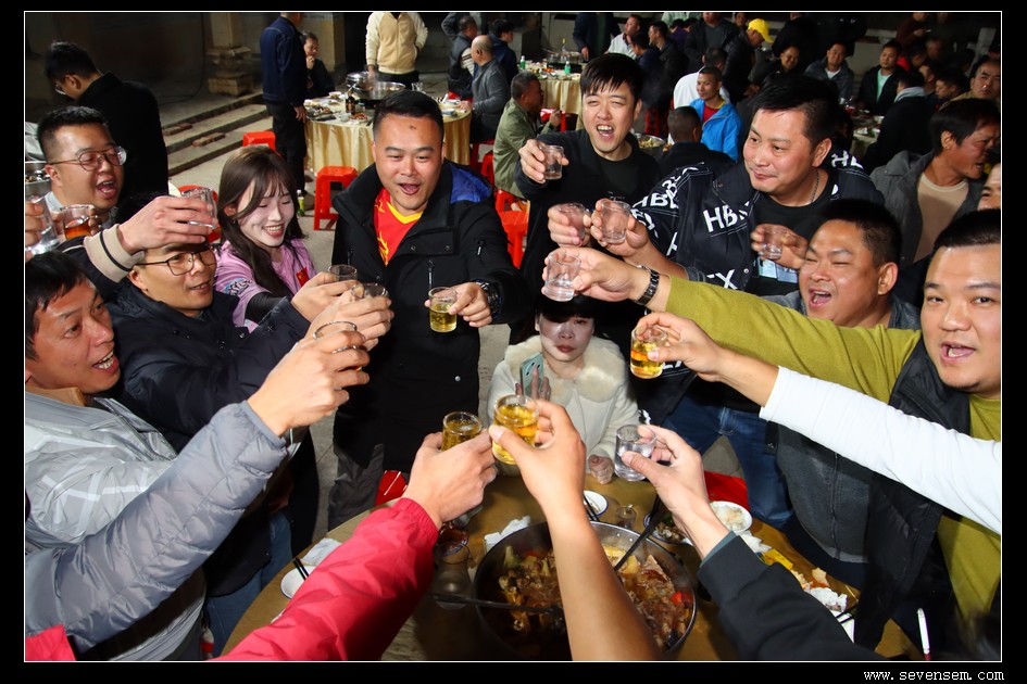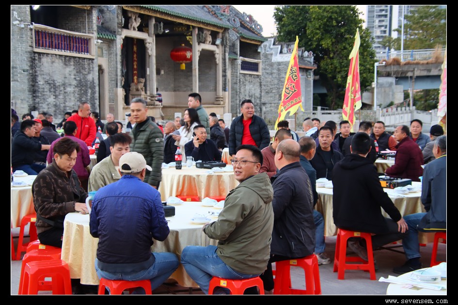 夜幕降临,祠堂内灯火通明,晚宴在温馨祥和的氛围中持续进行。大家举杯共饮,祝愿彼此新的一年里龙舟竞渡捷报频传,各村情谊源远流长。