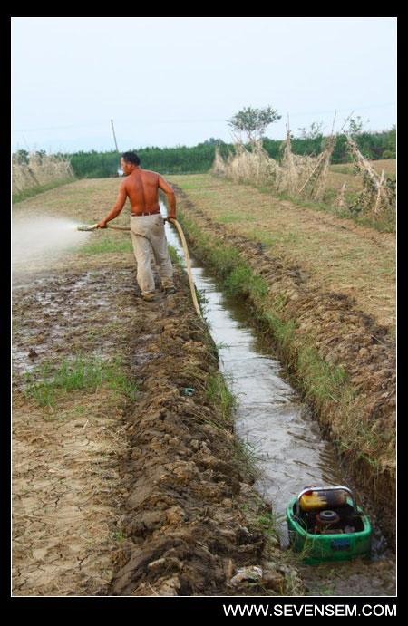 这位就是明仔哥哥的七叔了,淋水也现代化了,用柴油机加压抽水,不用一壳一壳地浇了。