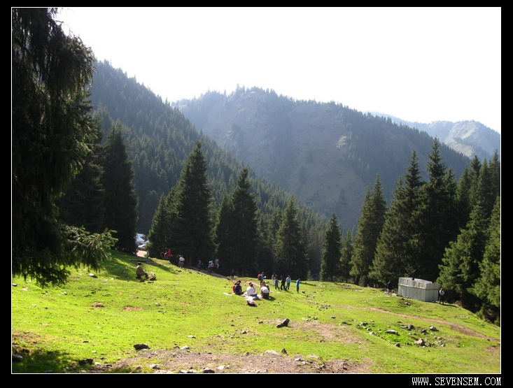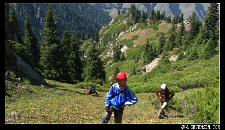 这种享受,委实难得。身心彻底放松。周遭的山有缓有陡,除草坡外,均生长着天山松,我们选了一处较陡的山坡,攀着一棵棵松树之字形向上,走散了,就大声互相呼叫,只听得头顶、旁边林间回荡着人声,但就是看不到人。